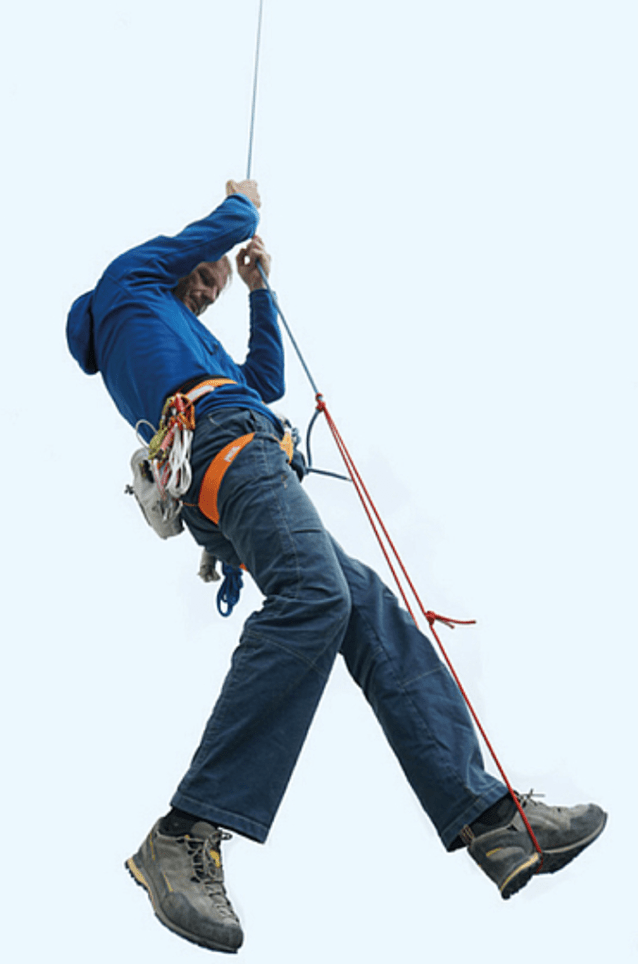 Come autosoccorso, risulta utile approntare un anello di corda (o utilizzare una fettuccia) vincolato sulla fune di carico che consenta la creazione di uno scalino, sul quale l’infortunato può scaricare parzialmente il peso.