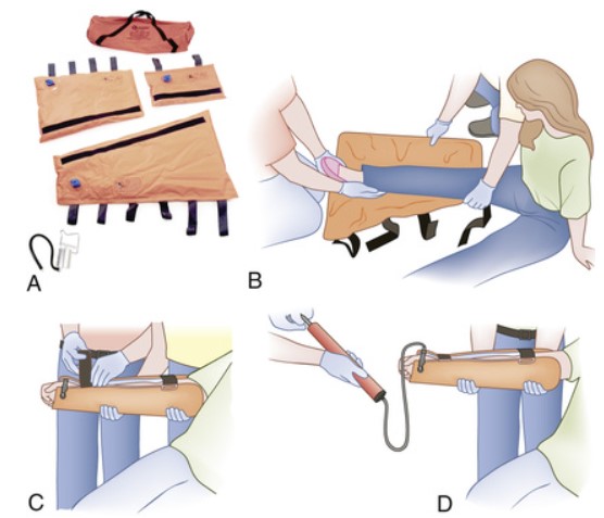 Per stabilizzare le lesioni degli arti superiori possono essere utilizzate stecche rigide e morbide . È sempre importante lasciare esposti i polpastrelli per consentire una valutazione continua dello stato neuro-vascolare. Sebbene i principi dell’immobilizzazione degli arti inferiori siano simili a quelli dell’arto superiore, le implicazioni non sono le stesse in termini di evacuazione: è più probabile che le fratture degli arti inferiori coinvolgano ossa portanti e quindi richiedano un’immobilizzazione rigida. Quando possibile, le lesioni degli arti vengono immobilizzate in una posizione funzionale.